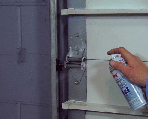 The hinges on your garage door help the panels bend as the door opens and closes. Spray a small amount of lubricant on the pivot points of each hinge. Once done, manually open and close the door a few times to spread the lubricant evenly for smooth movement.